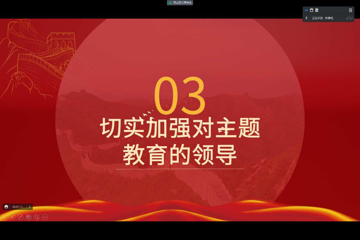 随后,彭静瑶就习近平同志对主题教育的要求从明确领导责任、强化督促指导、注重统筹兼顾、加强宣传引导四个部分进行了深入解读,并针对习近平总书记重要讲话整体分享了自己的理解与观点。彭静瑶提到,我们应当站在坚定拥护“两个确立”、坚决做到“两个维护”的政治高度,深入学习贯彻习近平总书记重要讲话精神,深刻认识开展主题教育的重大意义,进一步增强责任感使命感,牢牢把握“学思想、强党性、重实践、建新功”总要求,为奋进新征程、建功新时代凝心聚力。