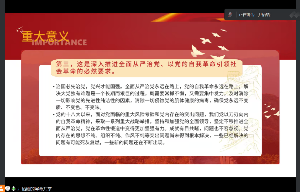 首先,尹怡皓带领全体同志回顾了习近平总书记的讲话内容,对习近平同志在会议中提出并展开解说的前两个问题进行了重点分析;强调了该次主题教育之于中国共产党与中国社会未来道路的重要性;明确了“学思想、强党性、重实践、建新功”总目标的含义;阐释了新时期“凝心铸魂筑牢根本”、“锤炼品格强化忠诚”、“实干担当促进发展”、“践行宗旨为民造福”、“廉洁奉公树立新风”的任务目标;解释了应全面落实的四项重点措施——“强化理论学习”、“深入调查研究”、“推动高质量发展”、“抓好检视整改”。