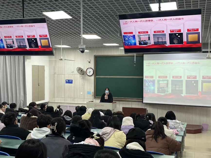 宣讲人孔庆钰首先抛出“为什么选择英语专业”的问题,引发了员工思考自己学习外语的初衷和期待。她带领同学们回顾了西电科技英语泰斗秦荻辉教授面向国家需求,从工科生转向英语教学,并栉风沐雨创建特色鲜明、专家认同、名副其实的科技英语的艰苦历程。她深情地说,正是像秦教授一样的西电人,匠心筑梦、为国奉献,西电才取得如此辉煌的发展成就。她鼓励新生深入思考,如何学好专业、增强个人竞争力,将小我融入大我之中,与时代发展同频共振。