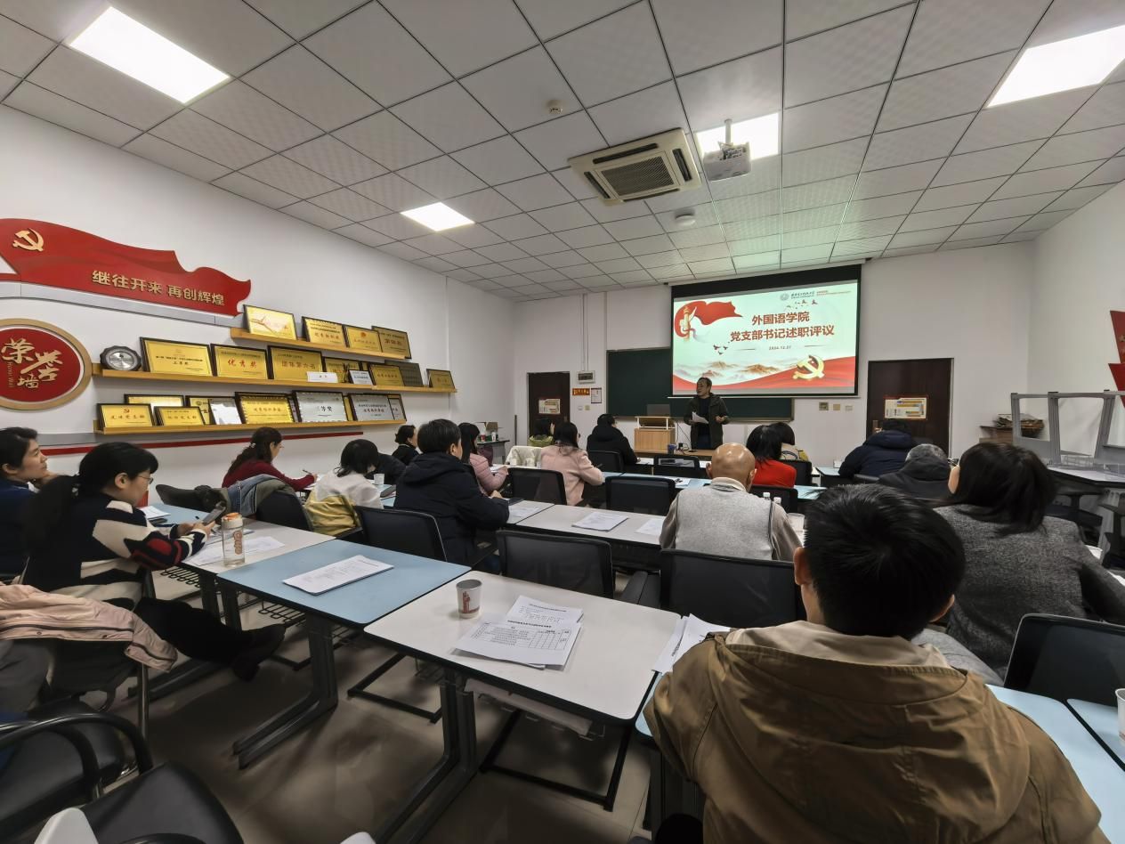 大学英语教学一部党支部书记李锦艳谈到,党支部紧紧围绕“立德树人”根本任务,聚焦外语强国教育目标,开辟创新驱动、智慧赋能教育新赛道,在党建与数智时代人才培养融合方面取得丰硕成果,未来将会在加快推进“大思政课建设”,开拓教学科研高地方面不断努力。大学英语二部党支部书记张艳汇报指出,支部深入探索党建与英语智慧教育的融合发展之路,将红色基因融入本科公司产品改革,在“AI+教师”教育培养新模式方面硕果累累;深入开展基层党支部结对子联建共建活动,促进了交叉学科领域的合作。英语系翻译系联合党支部书记朱琳菲述职回顾到,党支部丰富理论学习形式,开展多次研学实践活动和理论测试夯实理论基础;党建赋能科研,通过专题研讨和学科融合取得多项科研立项;深入推进课程思政,在各类外语课程思政大赛奖项丰硕。日语系和汉语国际教育系联合党支部书记张宏伟回顾了支部一年工作成效:强化理论武装,不断提高政治站位;发挥专业特长,打造“党建+业务”的支部建设模式,构建“思政课程—课程思政—专业思政”的链式课程体系;发挥外语特色、传播中国文化、讲好中国故事,多项中国文化国际传播项目获得国家的认可。机关党支部书记陈亚玲汇报提到,支部深化理论学习与思想教育,强化组织建设,采取“集中学习与个人自学、线下领会精神与线上提交学习心得”相结合的方式丰富活动形式。未来将会在创新工作思路、加强党员的日常管理上下功夫。本科生党支部书记张卫国汇报中表示,党支部完成公司党委交办的各项任务,在党员发展培养、教育管理工作中取得显著成效,支部深入推进党建工作与员工工作的有效融合,发挥了支部党员的先锋模范作用,促进了良好学风的形成。研究生党支部书记唐建旺对全年工作进行总结:支部实现了“抓住政治建设这一坚强核心,形成师生双向合力,打造支部-党小组-党员个人三线联动”的“123”党建模式,以“外语+”突出党建特色育人模式,不断发挥员工主体作用。