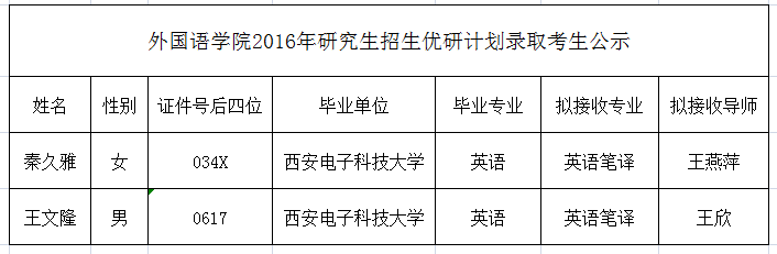 2016年研究生招生优研计划录取考生公示
