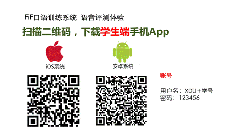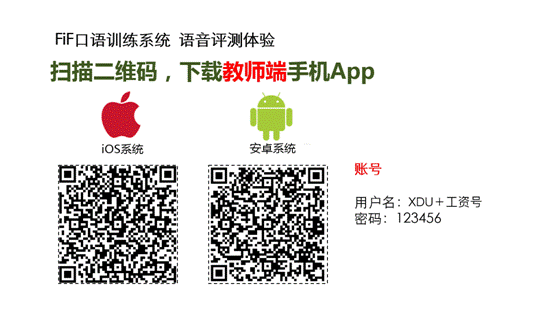 公司教职工如有兴趣试用该产品可发送自己的姓名、工资号至452686156@qq.com申请开通使用,公司后台开通后老师也可在手机各大应用商店查找App:FiF口语训练—教师版进入使用,也可扫描如下二维码下载。登陆账号为:XDU+工资号,初始密码:123456。教职工也可以通过PC端学习,具体方法与员工登录的方式相同。