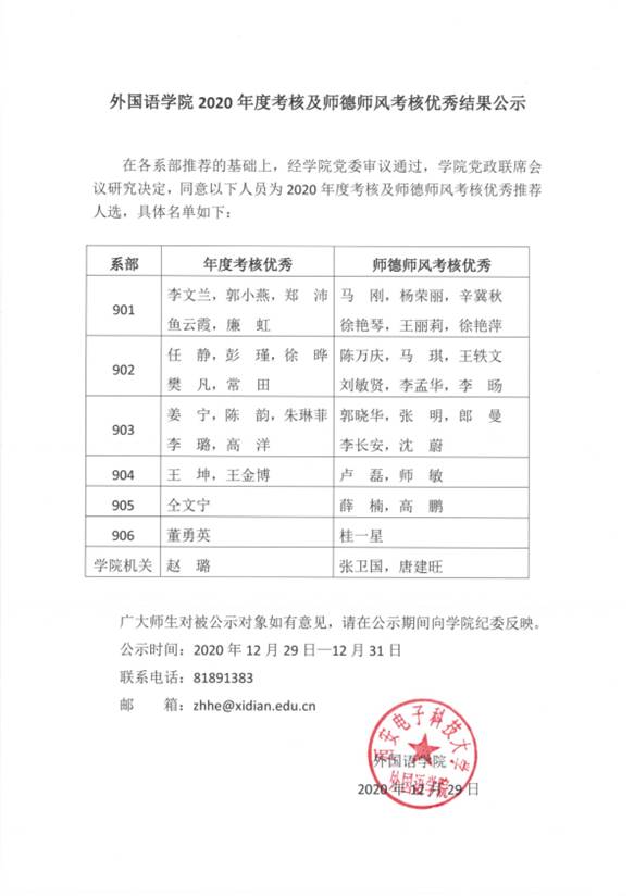 2020年度考核及师德师风考核优秀结果公示