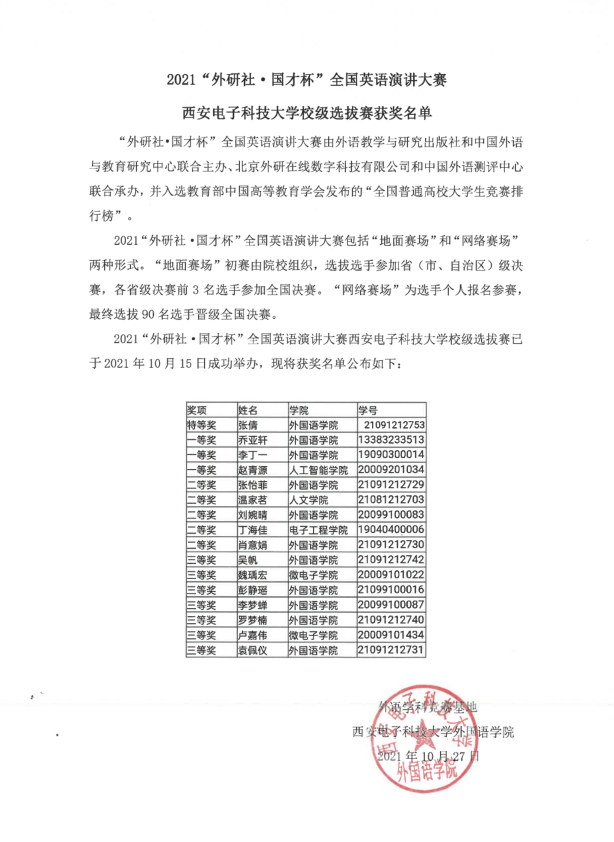 2021“外研社国才杯” 全国英语演讲大赛英国365集团公司校级选拔赛获奖名单