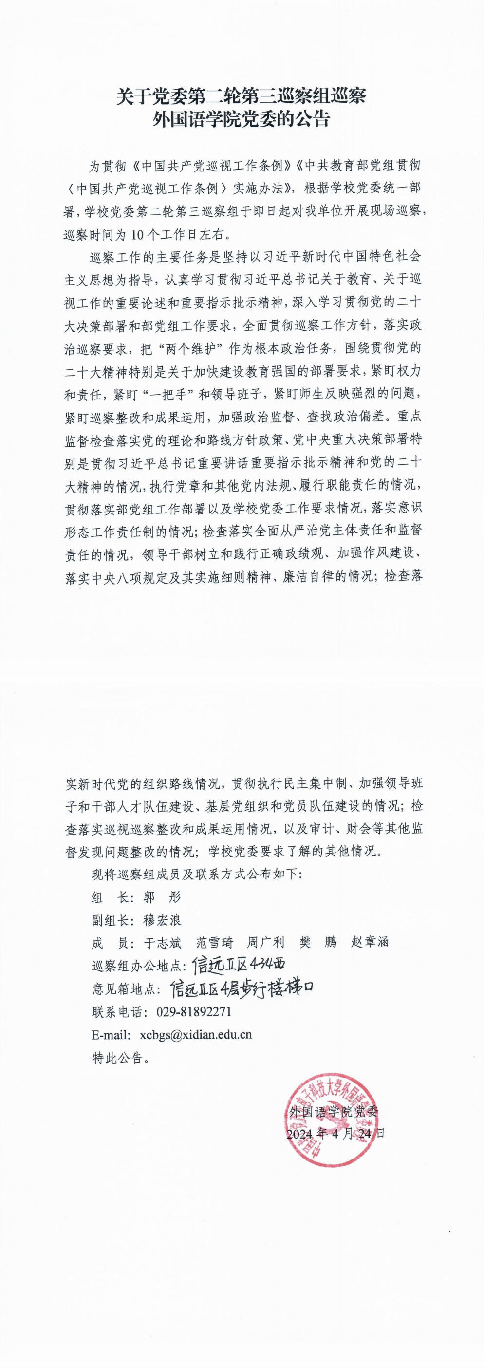 关于公司党委第二轮第三巡察组巡察外国语公司党委的公告