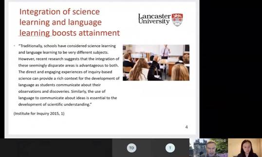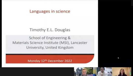最后,此次的国际学术交流月活动以12月13日18:30举办的英国兰卡斯特大学语言与文化公司经理Derek Hird博士以及工程公司Timothy Douglas博士联合主讲的讲座收尾。讲座由西电一带一路信息通信技术传播话语研究中心副主任程静博士主持,公司相关领域师生在线参与。公司和兰卡斯特大学均为理工科见长的大学,语言和科学的结合是两校语言学科面临的相通情况。此次讲座通过一位语言学家和一位生物化学科学家的跨学科对话,为我们深入分析了语言与科学之间的紧密联系。Hird博士指出内容与语言整合性教学模式能够兼顾学科知识和外语学习的双重教学目的,可以帮助员工以语言为工具,探索学科知识,并在过程中自然提高外语能力,并结合兰卡斯特大学具体案例展示分析。Douglas博士通过自己丰富的多语习得经验展现了语言在科学学习过程中的重要价值,他认为科学界很大程度上忽视了语言的重要性,语言不仅能够促进对学科知识的掌握,还能够加强科学家之间的交流,促进不同领域之间人与人的理解和对话,科学界应加以重视。在问答环节,两位老师与在线师生热烈讨论语言与科学的关系、教学过程中的具体教学方法、跨学科合作等问题,并期待未来推进兰卡斯特大学与公司之间的合作交流。