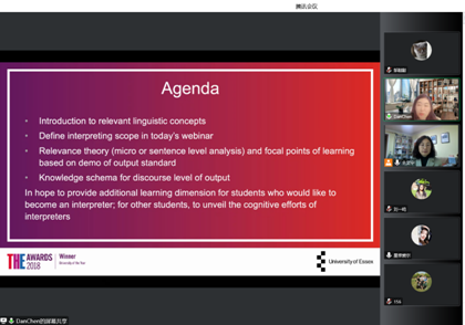 2022年11月16日16:30,本次活动首场讲座“Effective Language Acquisition for the Purpose of Interpreting”在腾讯会议平台精彩开讲。这次讲座由英国埃塞克斯大学高翻专业负责人陈丹副教授主讲,公司翻译系仝文宁主任担任主持人。陈丹教授从事专业口译工作多年,多次负责首脑级、部长级会议同声传译、陪同专题考察等活动,在众多领域有着丰富的口译经验。通过线上讲堂,陈丹教授以口译员与口译教师双重身份,分析了口译活动的不同传播目的,在不同的目的下译员所面临着来自语境和内容的技术挑战、演讲者语言风格的语言挑战,以及与会议主题和目的相关的知识图式。这些挑战的影响因素关乎口译的质量。因此,全面了解口译加工过程,反思在语境因素的约束下对源语信息的处理,有助于学习者为口译学习设定更具体的语言习得目标。讲座深入浅出、内容丰富,既有理论概括,又有实践内涵,具有很强的针对性和指导性,吸引了来自校内外百余名师生的积极参与。