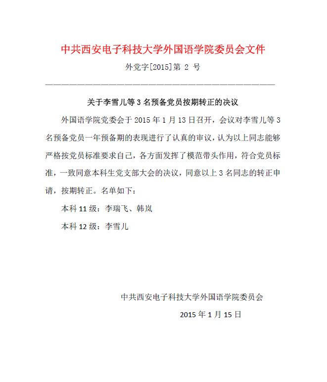 外国语公司党委会关于李雪儿等3名预备党员按期转正的决议