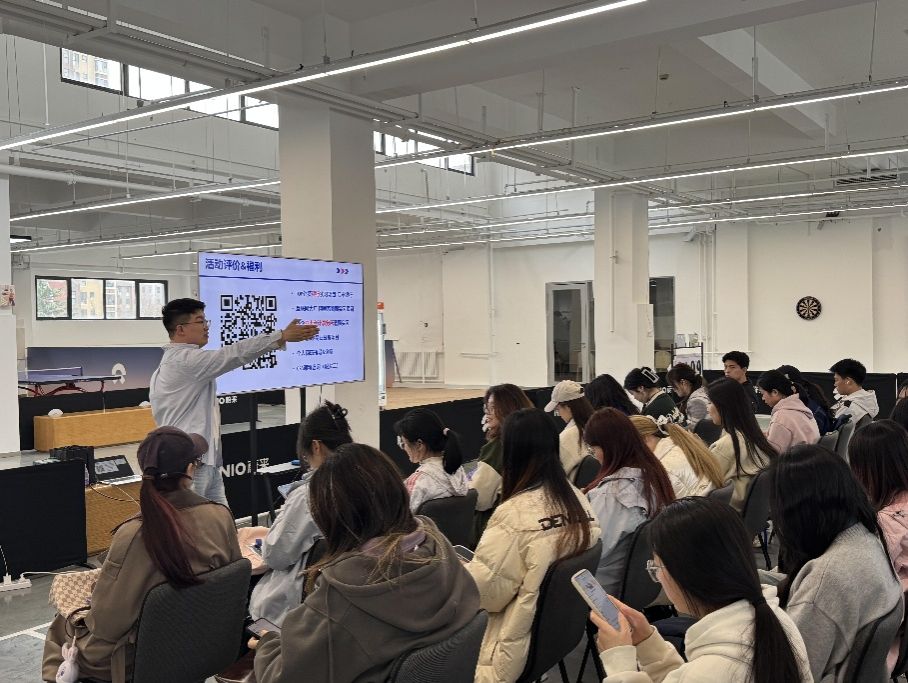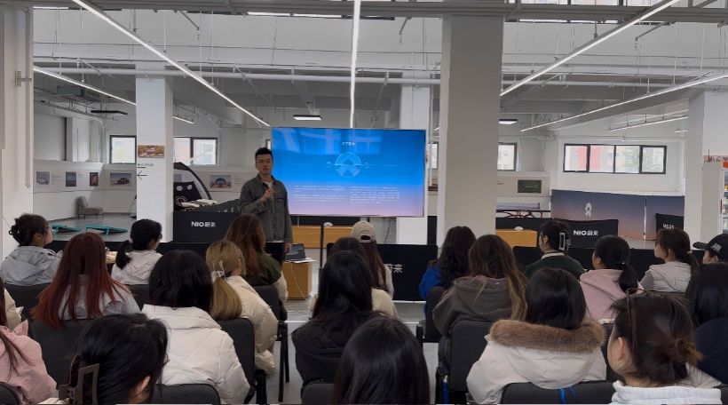 互动环节中,同学们积极提问,围绕职业发展、实习细节等与主讲人深入交流,现场气氛热烈。最后,同学们通过试驾试乘,亲身感受蔚来汽车的性能与设计,对新能源汽车行业前景更具信心。