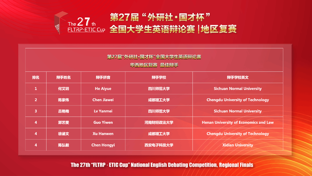 本次比赛共有华西赛区108支队伍216名辩手参赛,辩题紧密围绕社会热点,广泛涉及科技、社会、文化等多个领域,对选手的知识储备、思辨能力、社会关怀以及人文素养提出了极高要求。两位参赛同学在五轮循环赛中凭借扎实的语言功底、广博的知识储备、缜密的逻辑思维和敏捷的临场应变能力,最终以排名第七的好成绩,荣获华西赛区金奖,成功晋级全国总决赛。其中,陈弘毅以383分的个人总分,从两百余名辩手中脱颖而出,荣膺“最佳辩手”称号。