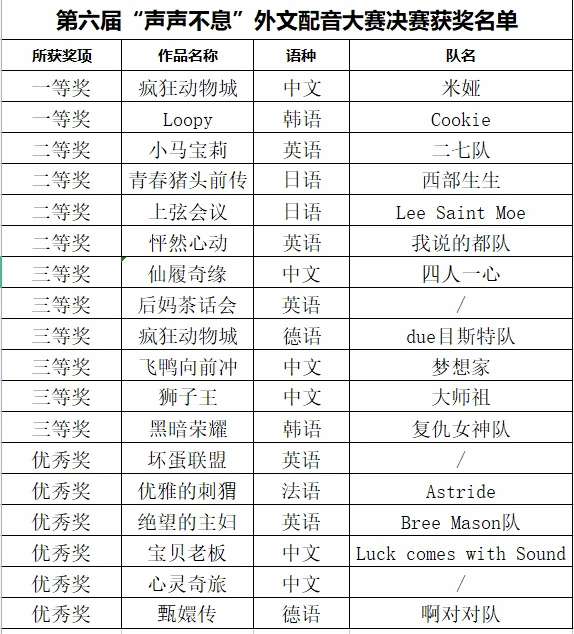 经过现场综合评定,获奖名单依次揭晓。韩语配音团队cookie和来自土库曼斯坦的职工中文配音团队米娅勇夺一等奖,二七队等四个团队获得二等奖,四人一心等团队获得三等奖。大师祖队获最佳人气奖。