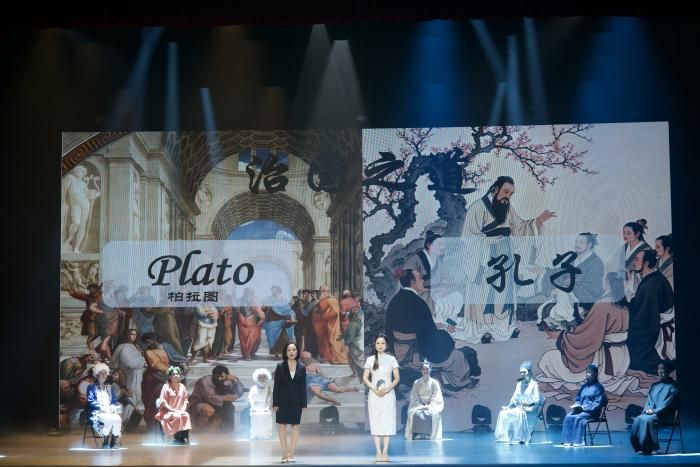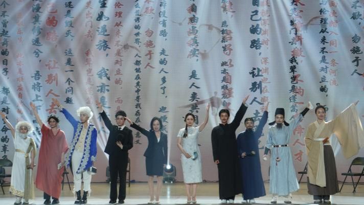 话剧展开丰富的想象,跨越中西方时空2000多年,以极富审美的舞台画面,形象诠释并完美演绎了语言之美、中西人文之思以及文明之鉴。团队以 “时空法庭” 搭建框架,以“时空穿梭”为叙事手法,八位女生化身为中西方思想和文学巨匠,通过四幕思想交锋—— 孔子与柏拉图论辩治国之道,李白与但丁对谈社会秩序建构,曹雪芹与卢梭探讨人性自由,鲁迅与卡夫卡剖析现代生存困境,围绕伦理与法治、信仰与秩序、改良与革命、现代救亡与异化展开辩论与交锋。话剧融合中英文表达,以简练和浓缩的方式,呈现了从公元前五世纪到二十世纪四个不同发展时期中西方思想的差异,体现了中西方思想在对话与交流中求同存异、互借互鉴的精神。表演以其时空视界的宏阔跨度、意蕴绕梁的哲思深度、让人情动的人文温度以及赏心悦目的艺术美感,赢得了观众的高度赞赏。