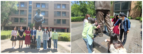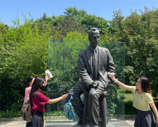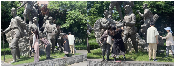 学习了相关校史文化后,院实践部的成员将大家分为三个小组并分别带队前往信远楼、老员工网络文化安全工作室和图书馆,对其附近的校史雕塑进行清洁。