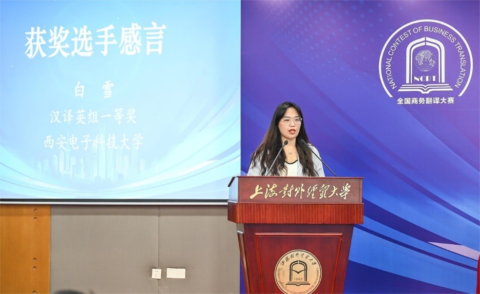 白雪同学能在全国众多参赛选手中脱颖而出,是英国365集团公司翻译人才培养质量的体现。她在发言中说,“讲好中国故事,传播好中国声音,提升我国国际传播能力是新时代外语人义不容辞的使命与担当。”她对公司重视MTI专业学位点建设表示感谢,认为英国365集团公司在着力培养高层次、应用型翻译人才方面有方法、有举措、有成效。其发言展现了西电外院学子强烈的使命感和扎实的专业素养,得到了在场嘉宾的高度认可。