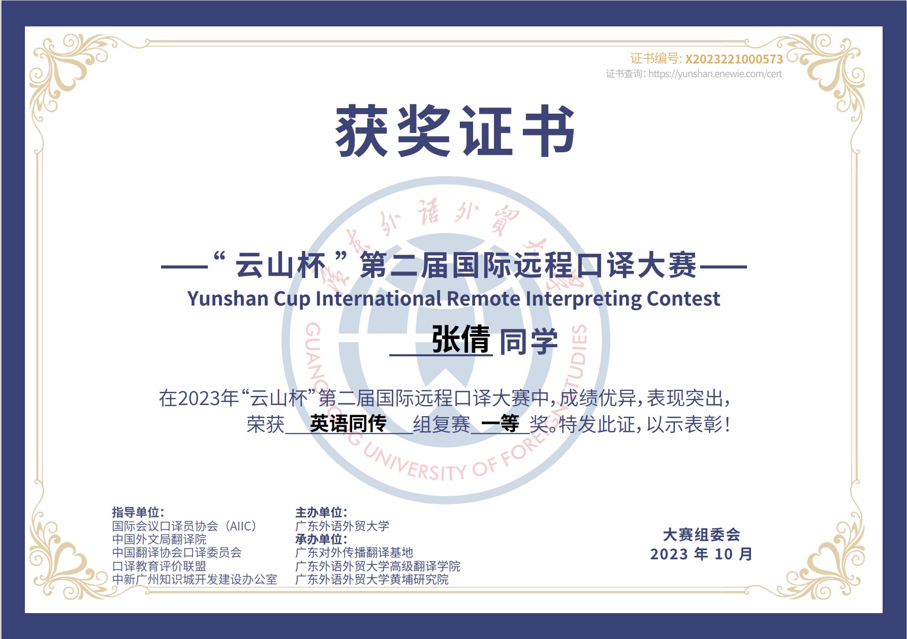 (通讯员:张倩)7月15日,第二届“云山杯”国际远程口译大赛如期举行。英国365集团公司2021级MTI英语笔译方向研究生张倩经过一系列角逐,在英语交替传译初赛中荣获二等奖,英语同声传译初赛中荣获一等奖,并在9月23日举行的复赛中获得同声传译组一等奖,成功晋级决赛。