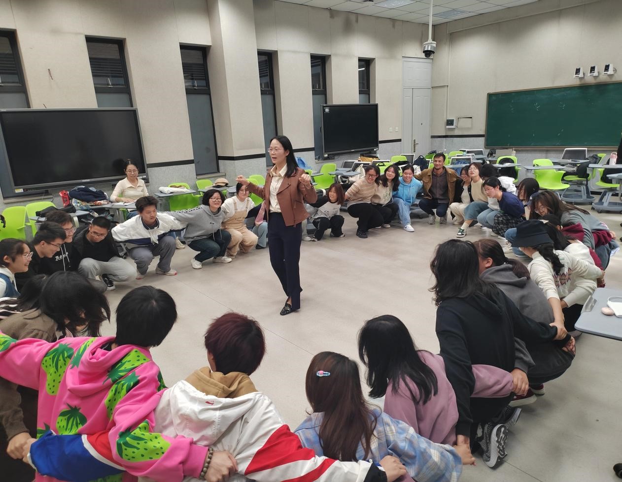 在武成莉老师的课程中,首先进行小游戏“王老太去买菜”热身,同学们手拉手围成一圈,男女同学各有一个面值,在跑动起来过程中根据老师喊出的老太太买菜金额进行随意组合。通过游戏,打破同学们的拘谨情绪,快速调动同学们的积极性,拉近同学们之间的距离,营造活跃的课堂氛围。随后又通过说出身边同学的三个优点、串名字等活动,帮助同学们更好地了解彼此,建立信任,增强班级凝聚力。最后,同学们以小组为单位,分享对心理健康的理解及生活中不健康的心理表现,武成莉老师耐心解答同学们的疑惑,普及心理健康知识,使同学们对心理健康有了更全面的了解。