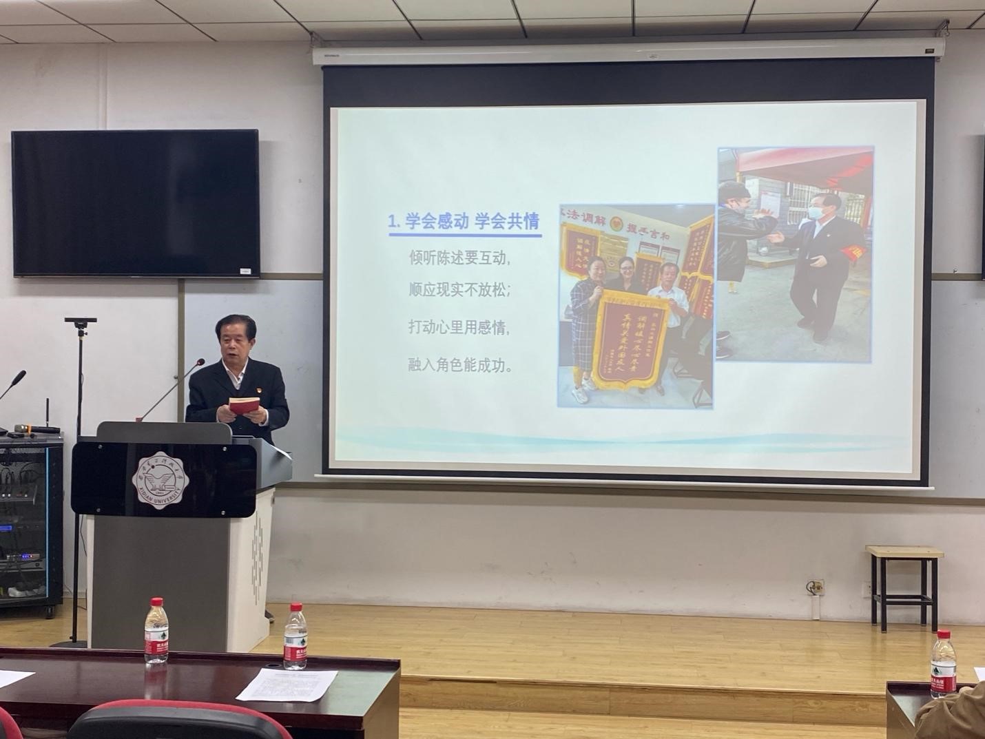在报告中,张兴无介绍了自己从部队退伍以后,坚守人民调解之路45年的经历。他详细阐述了调解过的4个案例,解读了人民调解员为人民服务的本色和初心。他指出,要做好人民调解员,就要坚持和发展新时代“枫桥经验”,着力提升矛盾纠纷预防化解法治化水平,坚持“五心五要五不要”工作原则,用心用情关心回应群众诉求,帮助群众解决问题,做到“小事不出村,大事不出镇,矛盾不上交,就地化解”。