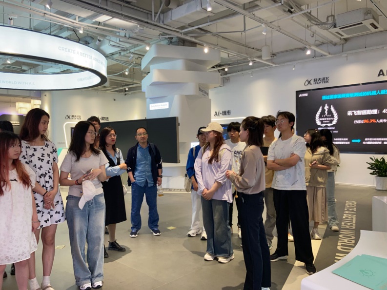 在工作人员带领下,大家参观了公司展馆,了解了公司发展壮大的历程。讲解人员介绍了科大讯飞著名的智能语音识别及翻译产品,为同学们展示了讯飞星火认知模型,以及科大讯飞将AI与办公、教育、医疗、城市建设、工业等领域深度融合的案例。工作人员还使用灵犀语音助手,向大家展示了通过语音指令让AI助手快捷服务生活需求等方面的操作。