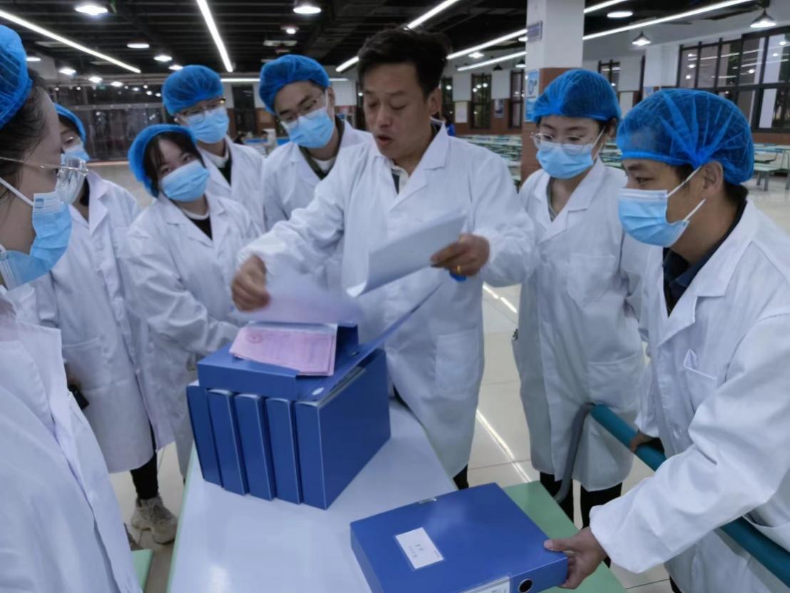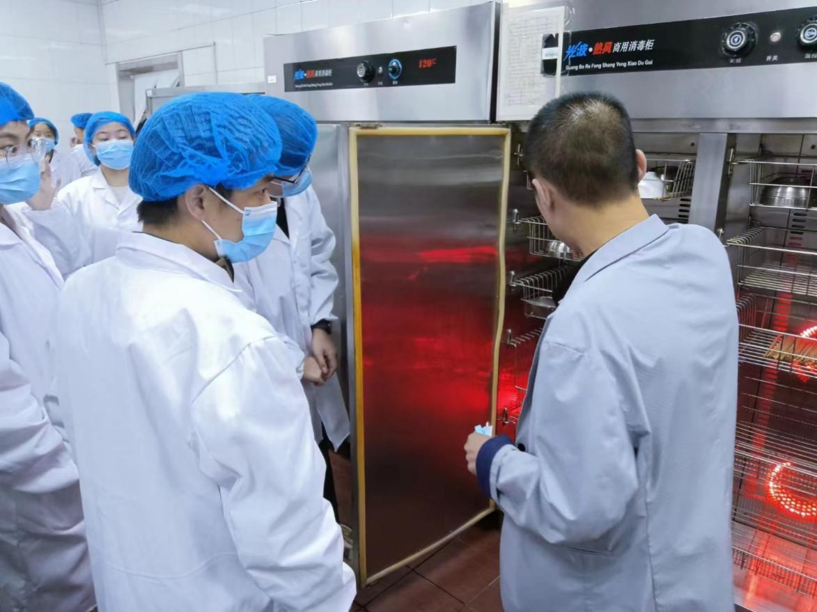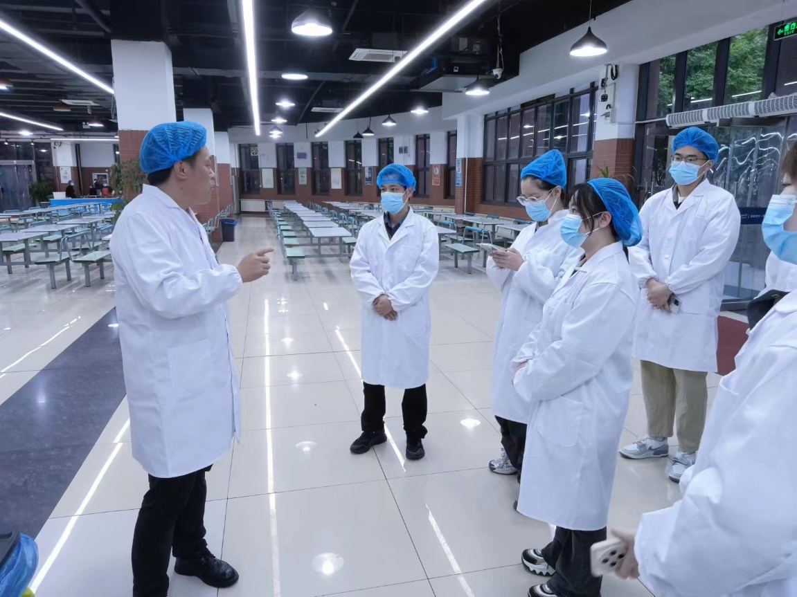 早餐期间,同学们穿戴好白色工作服和蓝色防尘帽后,进入食堂后厨参观。在食堂工作人员的带领下,同学们首先来到员工安全检查处,体验员工每日晨检流程。之后“导游”向同学们讲述了食堂根据公司用餐人数采购原材料,并进行材料验收的流程。同学们依次参观了蔬菜清洗间与切配间、餐具清洗间及消毒间等操作空间,了解了保鲜储藏柜、消毒柜、留样柜等相关设施的工作流程和使用方法,近距离观察了食品加工、餐具消毒等实际操作流程,对食堂的日常工作有了更加直观的感受。工作人员还向同学们展示了菜品肉品的检验报告,公开透明的信息让同学们对在公司用餐感到既安心又放心。