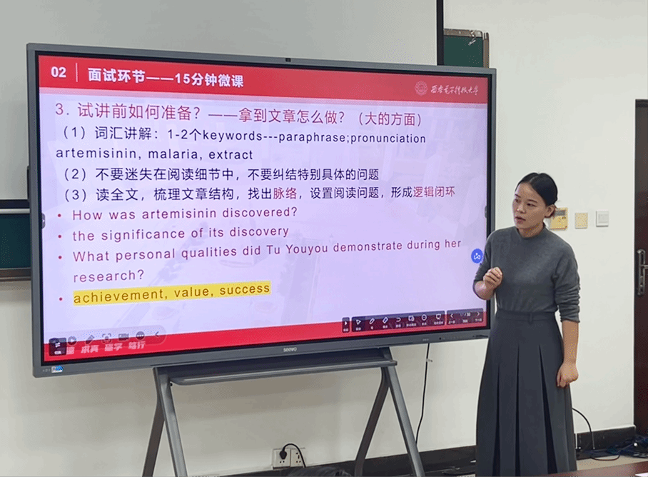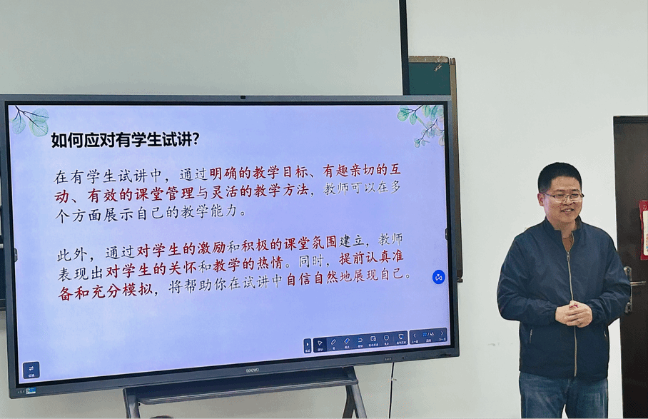 2021届毕业生、来自陕西师范大学附属小学的英语教师陈佳学长从小学英语教学的实际出发,详细阐述了不同课型的教学环节,并着重介绍了有声试讲与无声试讲的区别。他还就简笔画、粉笔字书写等板书设计环节进行了示范和讲解,强调了板书在教学中的重要性。陈佳学长强调,在小学课堂上要特别关注员工的身心特点,灵活调整教学方法。他还就如何熟悉教学重难点、把握教学过程、了解教学形式与评价标准以及说课技巧等方面进行了深入剖析。