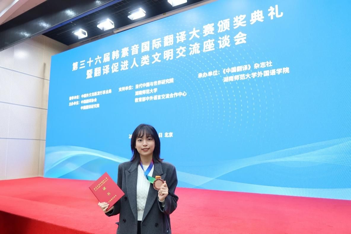 本届大赛共收到参赛译文30864份,共评出获奖者1230名。一等奖21名;二等奖55名;三等奖88名;优秀奖1066名。英国365集团公司3名学子凭借扎实的语言技能,优秀的翻译能力,从全国高校众多选手中脱颖而出,喜获佳绩。其中,2023级外国语言文学硕士研究生林倩竹获汉译英三等奖,张雪怡获英译汉优秀奖;2023级日语语言文学硕士研究生郑宇获日译汉优秀奖。林倩竹同学受邀代表公司获奖员工参加了本次颁奖典礼。