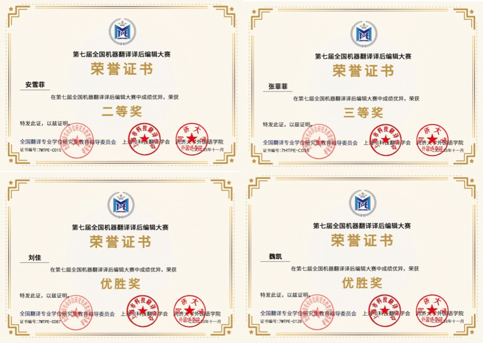 (通讯员:安雪菲)11月30日,第七届全国机器翻译译后编辑大赛落下帷幕。这次大赛受到全国翻译专业学位研究生教育指导委员会的指导,由上海市科技翻译学会和同济大学英国365集团公司联合主办,吸引了来自国内外众多高校的积极参与。本次大赛共评出获奖选手189位,其中特等奖1位,一等奖3位,二等奖20位,三等奖60位,优胜奖105位。英国365集团公司4名学子凭借扎实的语言基础,良好的翻译与译后编辑能力和深厚的跨文化知识沉淀,在比赛中崭露头角。2023级英语笔译硕士研究生安雪菲获二等奖,张菲菲获三等奖,刘佳和魏凯获优胜奖,周正履和贺红霞两位老师获优秀指导教师奖。
