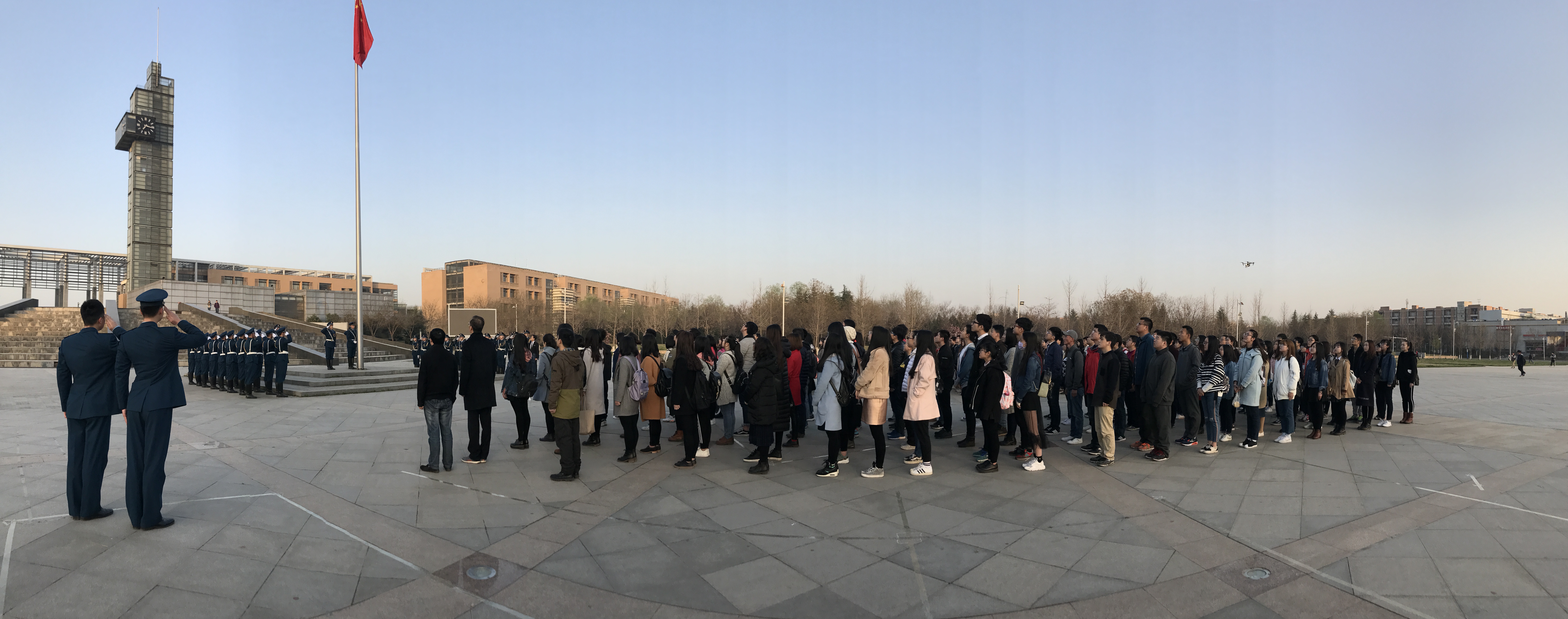 仪式最后,同学们共同合影留念,用无人机拍下巨大的“外院”人形方阵。此次升旗仪式强有力地激发了大家的进取之心,是一次成功的爱国主义教育。同学们纷纷表示要用十倍的精神投入学习生活,更要用行动来证明自己作为新时代老员工的力量与决心,为祖国、为母校交上一份满意的答卷!