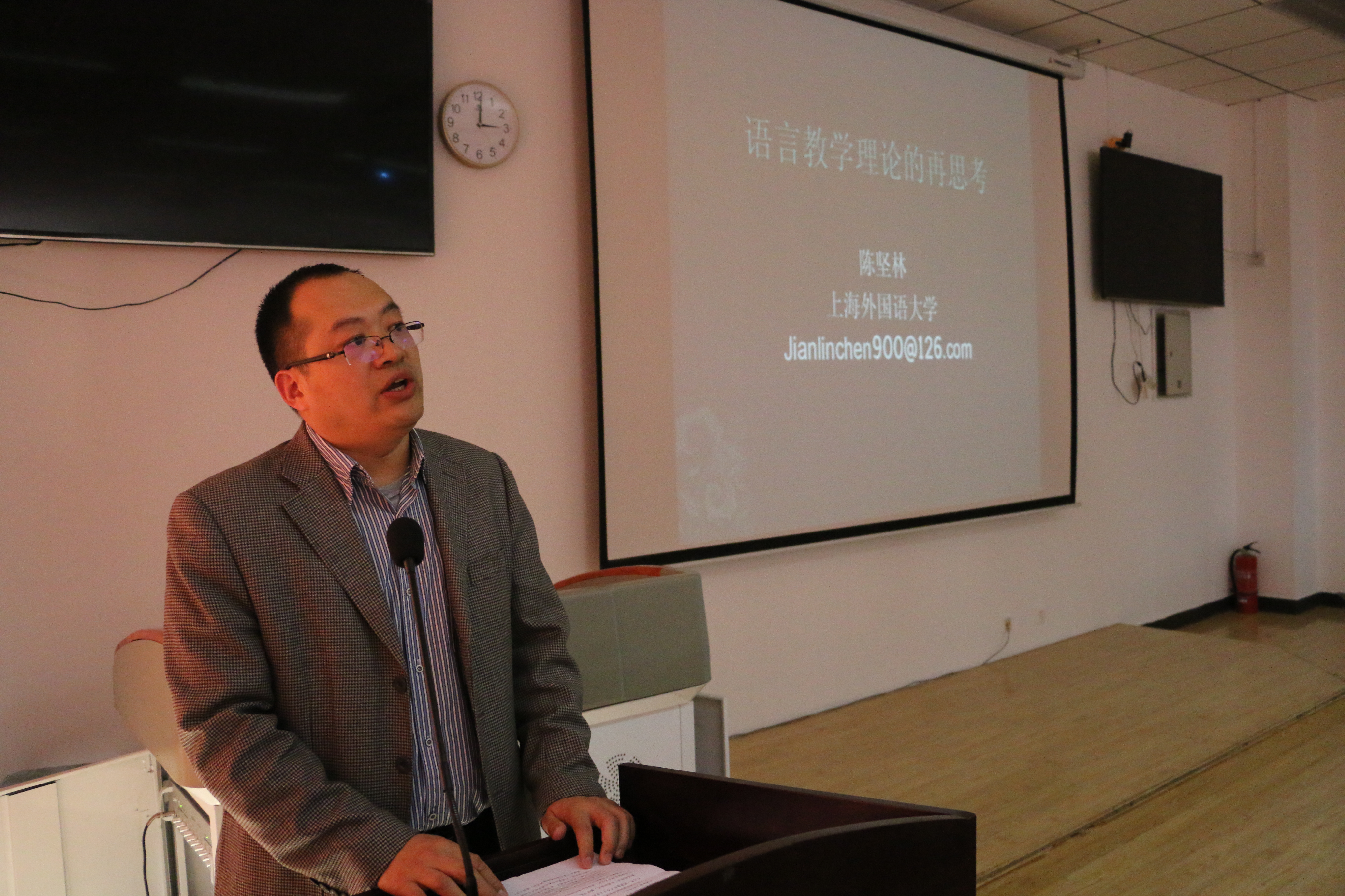 第一场报告的主题为“语言教学理论的再思考”,陈坚林教授在报告中以信息化进程为切入点,审视了外语教学观的演变。之后陈教授解读了信息化时代外语教学的主要理论支撑,包括应用语言学、第二语言习得研究和教育语言学,并围绕语言教什么、语言如何教、学习者如何有效习得语言等进行了探讨。对于二语与外语的区别,陈教授进行了深入的解析。此外,他还指出了我国语言研究中的薄弱环节以及迫切需要解决的问题,如语言与思维、外语教育政策、隐形课程等,并鼓励大家选定方向、找准突破口来申报科研项目,以科研促教学。