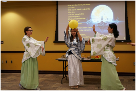第一个节目由修读Chinese100与Chinese200课程的美国员工主演,讲述了后羿射日与嫦娥奔月的故事。员工们全程用中文扮演,风格活泼生动,大胆自然,节目十分有趣。观众席中时常传来一声声笑声,气氛尤为热烈。接着是诗词串烧,来自中国、美国、法国、尼泊尔、越南、西班牙、瑞典、韩国以及日本的嘉宾们伴着美妙的音乐声自豪地朗诵自己国家赞美月亮的诗歌,这样的场景给在座的观众另一种震撼。第三个节目是由中国员工和美国员工共同表演的祭月仪式。祭月仪式由三上香、三祭酒、读祝、拜月、从献、礼成和饮餕七个部分构成。在仪式进行过程中,在座外国来宾被古典的中华礼乐所吸引,不禁发出阵阵赞美。