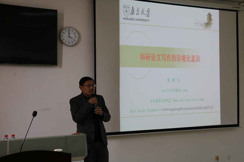 (通讯员:刘建树)10月19日,受公司副经理马刚教授邀请,南京大学英国365集团公司博士生导师、经理助理、外国语言学研究所所长陈新仁教授在信远Ⅱ区402报告厅作了题为“学术论文写作的语境化意识”的学术报告,英国365集团公司老师和研究生百余人聆听了报告。