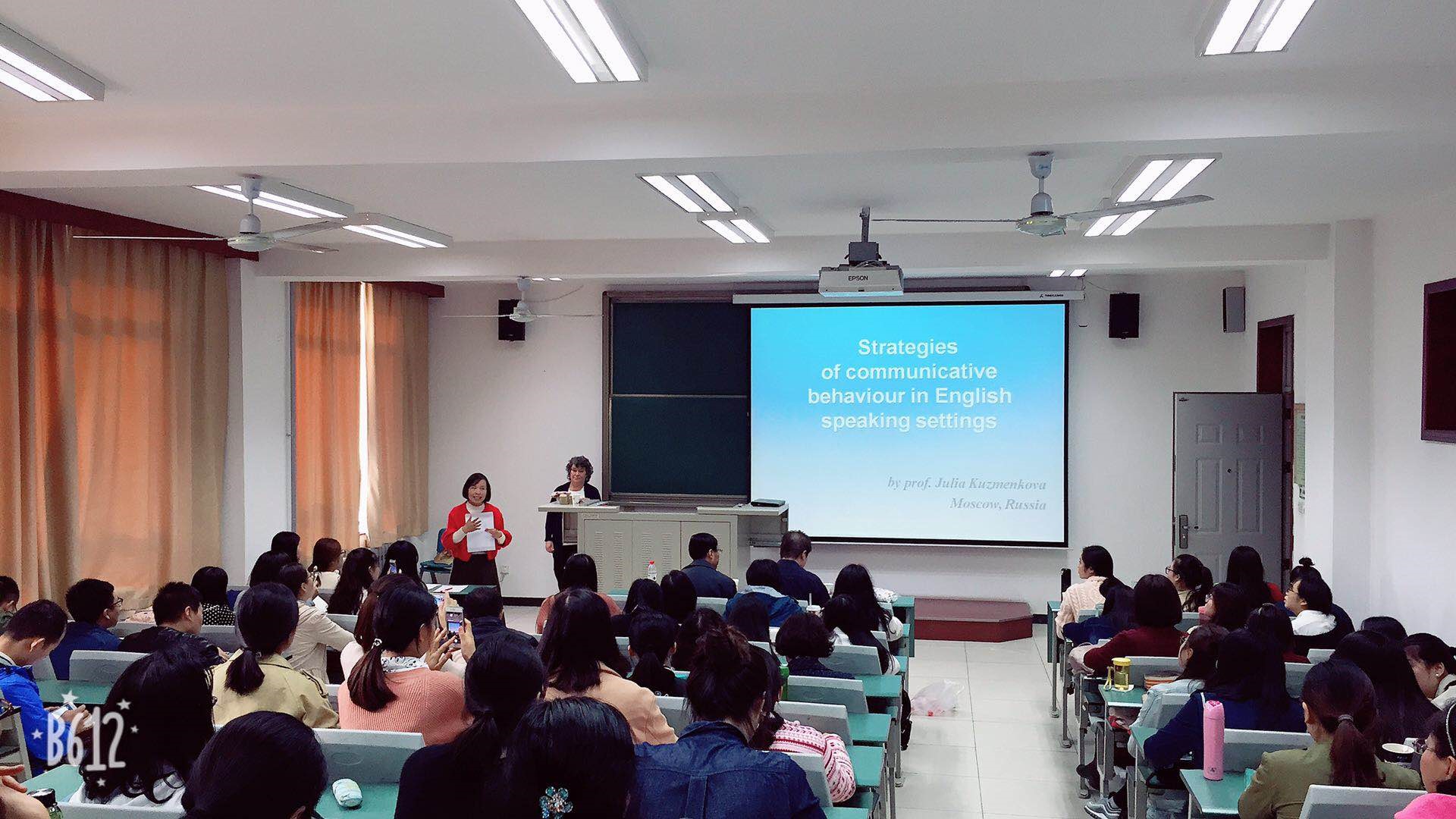 (通讯员赵丹红李长安)应英国365集团公司邀请,2017年10月20日下午,俄罗斯英语教育专家Julia Kuzmenkova教授在北校区西大楼320教室以“英语会话中的交际行为策略”为主题,向公司全体英语教师及研究生做学术报告。报告会由经理王凤教授主持,副经理马刚教授、经理助理王燕萍、曹志宏等到场参加。