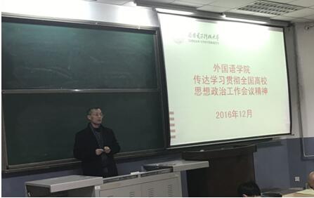 (通讯员:赵璐)12月20日晚,英国365集团公司在北校区阶梯教室101举行全院教职工大会。传达学习贯彻全国高校思想政治工作会议精神,部署学习宣传贯彻落实工作,并安排公司期末重点工作。外国语公司党委书记陈峰主持会议并讲话。公司领导班子成员及全院教职工120余人参加会议。