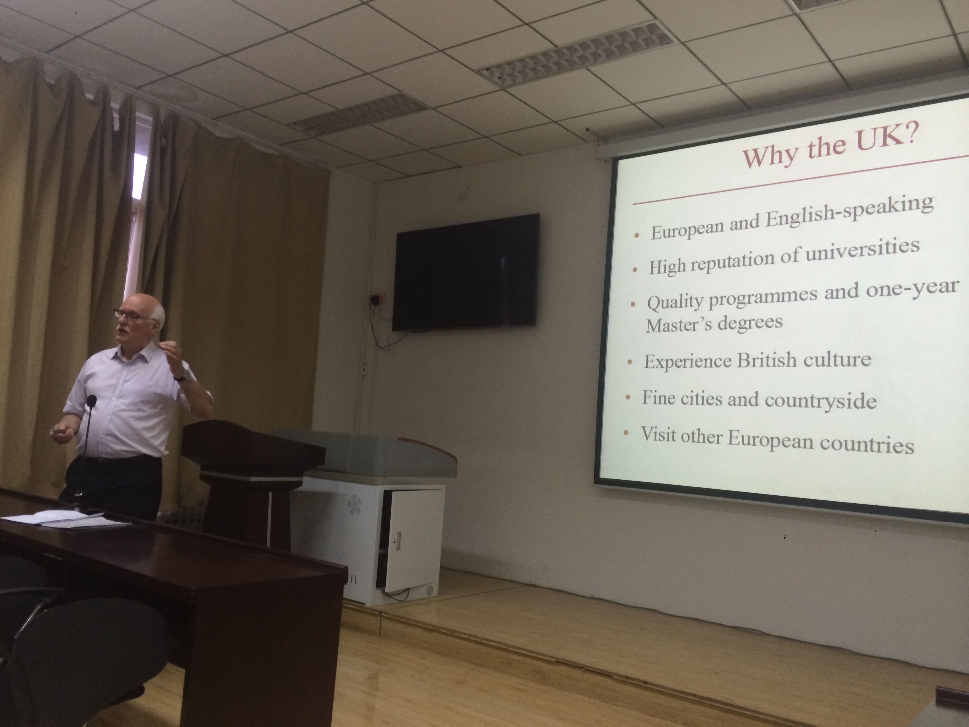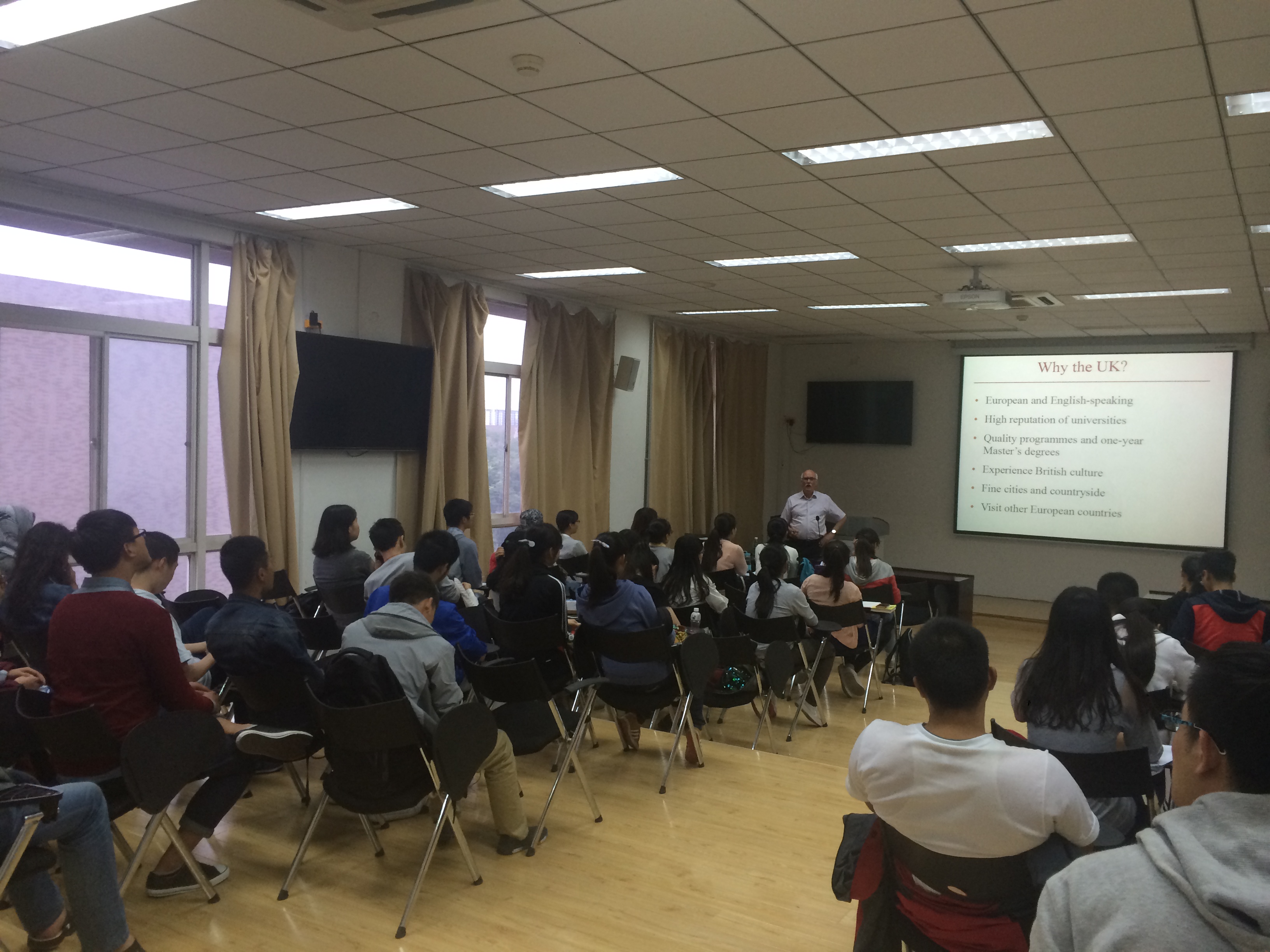 在题为Applying for a Master’s Degree to a UK University(如何申请在英国大学攻读硕士学位)的报告中,Tony Pearson先生首先概述了选择英国大学攻读硕士学位的优势及英国知名大学的地理分布情况,之后详细描述了英国一年制硕士学位的时间跨度、学习任务、授课方式、考核模式等各个方面,同时辅以图片详细介绍了英国六类大学中的处于领先水平的佼佼者。接下来,他从如何选择大学入手,探讨了课程设置、大学名气、地理位置、学费和奖学金、住宿条件等各个因素,列出了大部分英国知名大学对于攻读硕士学位国际员工的具体要求,包括课业成绩、英语水平、雅思成绩等,并建议了英语专业员工可以选择的一些相关硕士专业。紧接着,他详细说明了签证申请、撰写个人简介的注意事项,同时也囊括了一些更为生活化的内容,例如学习期间的打工要求,员工寝室环境、运动设施配备等,讲解的内容面面俱到,通俗易懂,贴近生活,引发在场员工的阵阵笑声和掌声。
