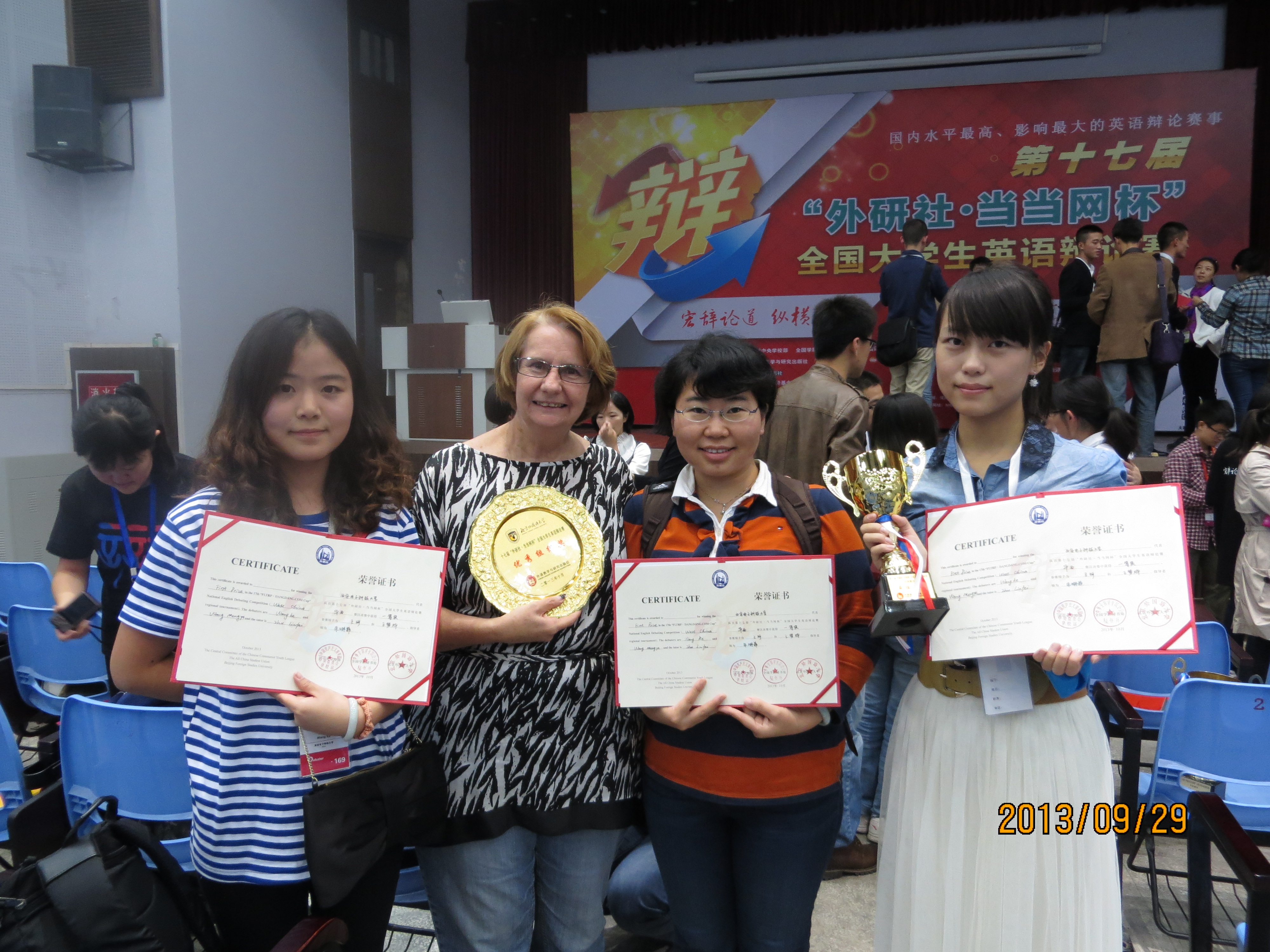 [通讯员:朱琳菲] 9月26日至9月29日,第十七届“外研社·当当网杯”全国老员工英语辩论赛(华西赛区)在四川大学举行。英国365集团公司外教Deborah Howard受组委会邀请担任本次大赛的副主裁。英国365集团公司朱琳菲老师带领本科2011级电子工程公司王梦烨和经济管理公司员工王珂组队参赛,在华西赛区8省近50支参赛队伍中脱颖而出,荣获一等奖,顺利晋级10月份在北京举行的外研社全国老员工英语辩论赛总决赛。同时,电子工程公司王梦烨获得本次大赛 “最佳辩手”(共6名)奖。为了表彰教练的优秀指导和队员精彩出色的表现,公司荣获得了组委会颁发的“优秀组织奖”。