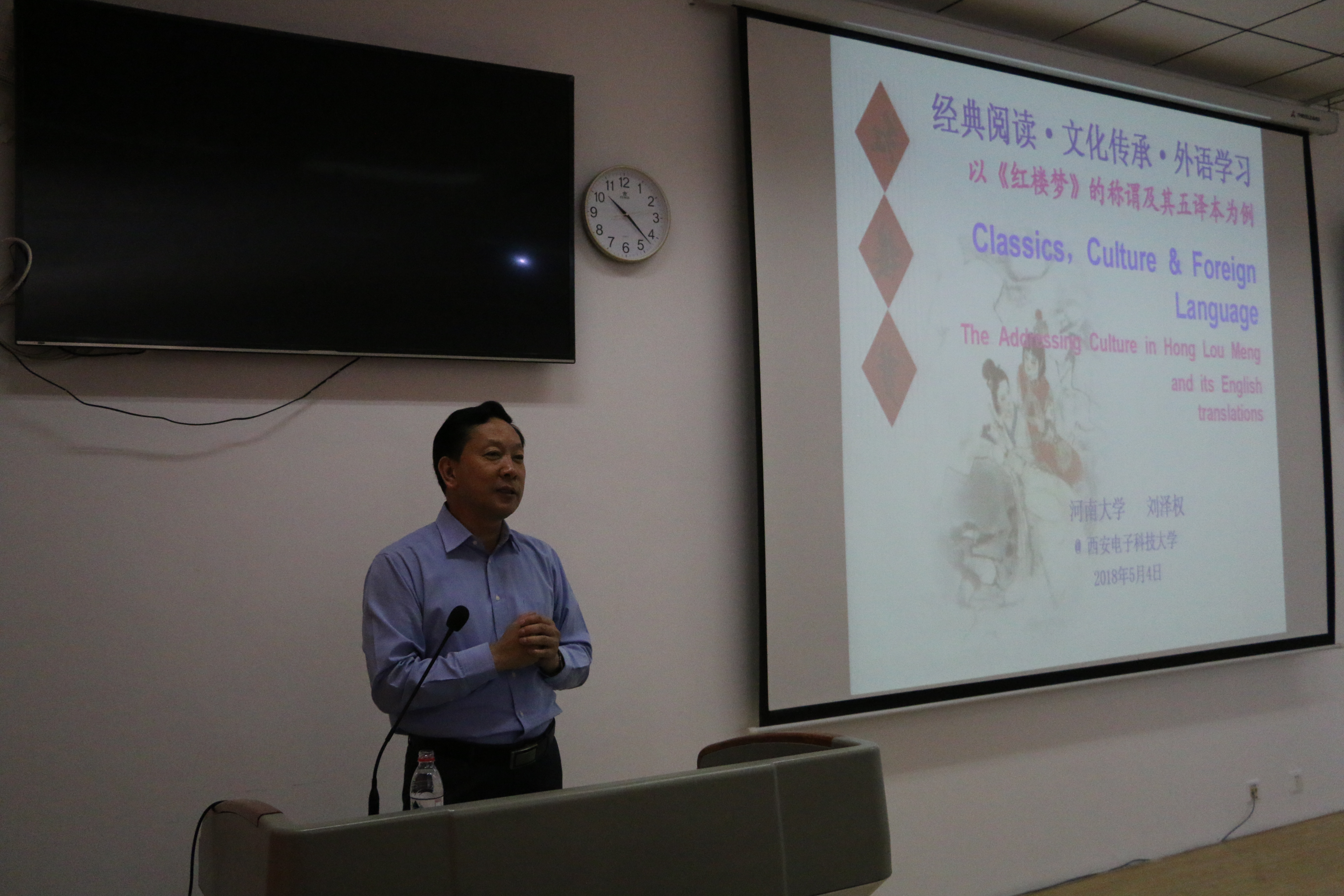 (通讯员:戴玉霞) 2018年5月4日,河南大学“黄河学者”,博士生导师,刘泽权教授在公司402教室进行了题为《经典阅读·文化传承·外语学习——以《红楼梦》的称谓及其五种英译为例》的精彩讲座。