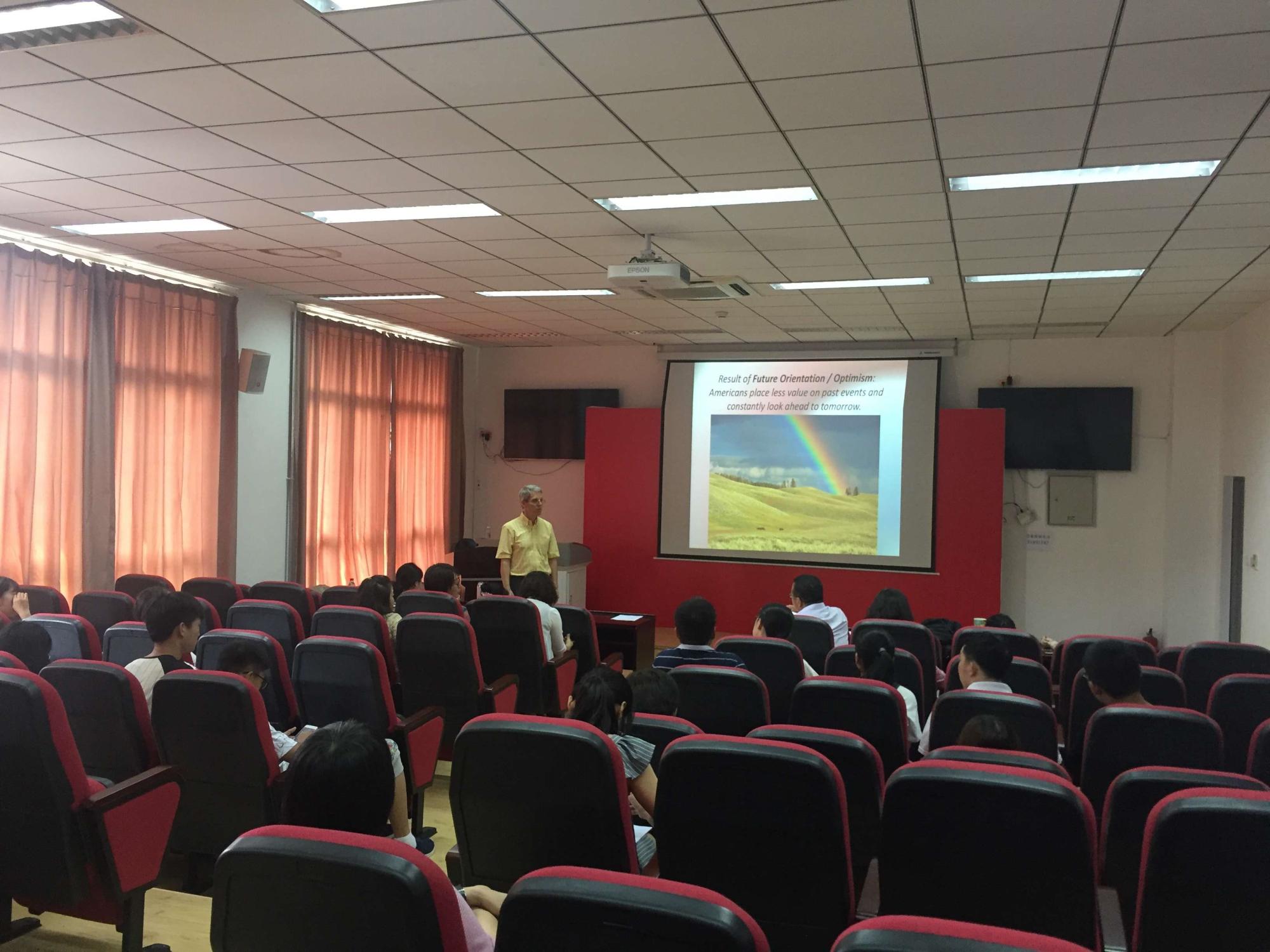 讲座前,John Robertson为每一位在座的同学分发了本次讲座的纸质提要。邹甜甜老师代表英国365集团公司全体师生向John致以最诚挚的问候,并为大家介绍了这位来自美国USCB的教授丰富的教学经历。在同学们热烈的掌声中,他简述了美国文化的主要特点,一场精彩纷呈的讲座正式拉开帷幕。