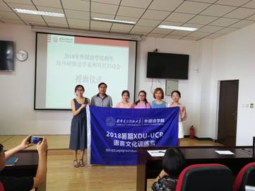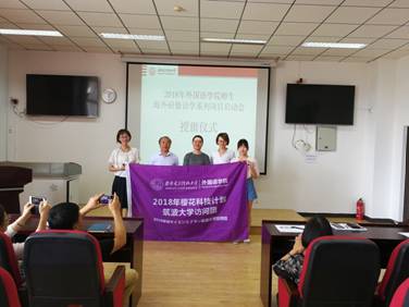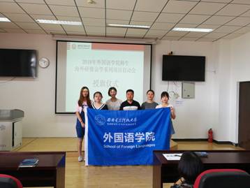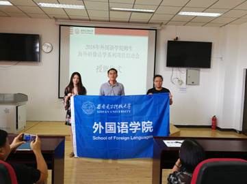 最后,公司领导分别给参加暑期海外研修的各个团队授团旗。 翻译系主任仝文宁、大英一部副主任辛冀秋、日语系王金博老师以及刚刚结束了在美国密苏里西部州立大学一年交换学习的15级翻译系王心怡同学与大家分享了各自海外学习的经历和感悟,并对即将赴海外研修的师生们提供了很多好的建议。