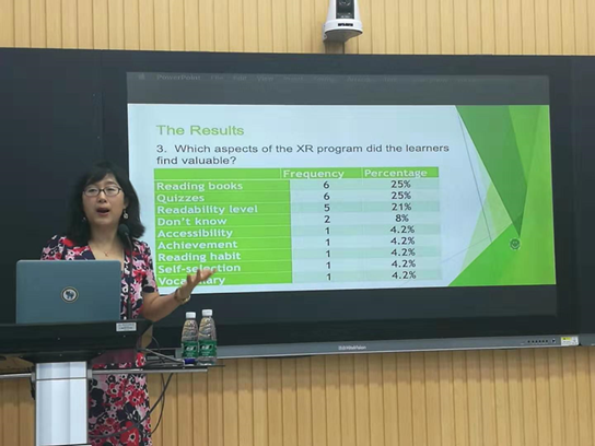 Zhou Jing助理教授在Online Extensive Reading in EAP Course讲座中介绍了她和她的团队在美国高校开展的网上泛读在学术英语课程中使用的研究,研究考察了57名留美老员工和他们学术英语阅读课程老师使用XReading网络分级读物图书馆进行为期两个学期的泛读学习后的效果和反馈。研究发现网上泛读一个学期后员工的阅读态度便有显著提升。两学期后员工阅读速度、词汇、语法、阅读理解、写作和口语水平均有提高。