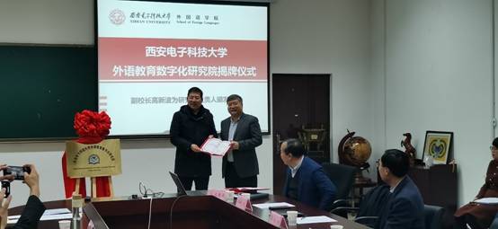 高新波向外语教育数字化研究院经理杨跃教授、副经理马刚教授、副经理陈万庆副教授颁发了聘书。