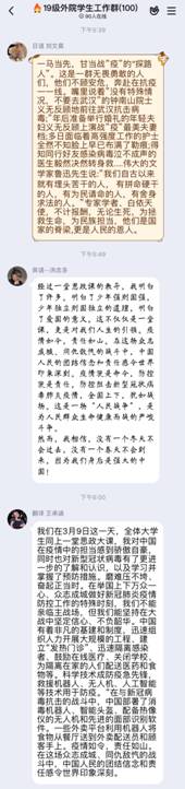 短暂休息后,同学们对所看课程进行了交流。武钰旻同学申请连麦发言道:“观看了这节课我感触真的很大,在疫情防控工作中,我们的社会主义优越性毋庸置疑,党员干部的先进性愈发突出。中国人民,中国态度,再一次证明了它的正确性!”在后面的连麦发言中,朱皓然同学说道:“路虽远,行则将至。事虽难,做则必成。抗疫情,众志成城。相信中国人民,一定会跨过这道坎。当枝头花儿开放的时候,一切都将是新的美好的开始。中国加油!我们一定能够胜利!”张稀歧同学说:“这次疫情告诉了我们什么呢?我觉得最重要的就是多难兴邦。这次疫情。真切地体现了中国共产党领导的优势,以及中国特色社会主义制度的优势也体现了中国自古以来的传统美德一方有难八方支援。我们应该做到拥护中国共产党。零零后这一代并不是颓废的一代。他们在祖国最需要的时候依然站在了前线。所以我对祖国的未来充满信心!”