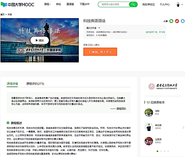 《科技英语语法》课程由公司科技英语省级教学团队开发,在课程负责人、公司执行经理马刚教授和课程建设运营负责人、副经理李长安副教授规划带领下,主讲教师王燕萍、曹志宏、仝文宁、周正履、任利华、张鹏华、孙玲玲、张明、马琪、朱琳菲等团队成员拼搏进取,攻坚克难,经过近三年时间辛勤建设,于2018年2月顺利上线中国大学MOOC平台运行,之后又于2019年3月上线中国高校外语慕课平台和中国大学专业共享联盟平台。2019年4月,由中国高校外语慕课平台推荐,成功登陆中共中央宣传部“学习强国”平台推广。
