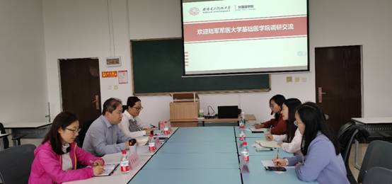 陆军军医大学基础医公司医学英语教研室主任罗茜教授对该校的基本情况和特色专业进行介绍,明确提出调研重点:学术类英语写作课程设置和具体实施方案。医学英语本科组教学负责人詹小青老师、研究生组教学负责人谭雪焦老师也就医学英语教学现状及存在的困惑进行说明。
