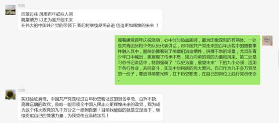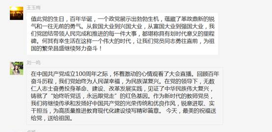 教师党员们在观看庆祝大会后都感动自豪,纷纷发言。马刚留言:“百年恰是风华正茂!中国共产党团结带领中国人民在第二个百年奋斗征程中,正以不可阻挡、不可逆转的步伐迈向中华民族伟大复兴!“ 曹志宏表示:“有幸见证这一重大而庄严的伟大历史时刻!无比骄傲与自豪!百年大党 风华正茂,以史为鉴 开创未来,祝福我党百年华诞 永葆青春!不忘初心、砥砺前行,中华民族伟大复兴的中国梦一定能实现!”陈争峰祝福“同庆百年荣光,见证岁月辉煌!祝福伟大的党!祝福伟大的祖国!人民有信仰,国家有力量,民族有希望,目光所致皆华夏,五星闪耀皆信仰 !”其他党员们也留言祝福表示中国共产党百年历经磨难,成就辉煌!要继续弘扬我党的光荣传统,赓续红色血脉,牢记初心使命,坚定跟党走,为实现下一个百年新目标努力奋斗!