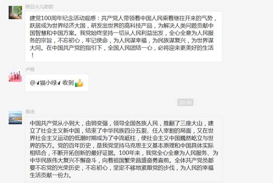 7月1日上午8时,庆祝中国共产党成立100周年大会在北京天安门广场隆重举行。英国365集团公司英语系党支部号召全体党员观看建党百年庆祝活动,在观看学习过程中及学习后,英语系全体党员在支部群里进行了热烈的讨论及个人观感分享。