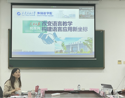 随后,会议进入主旨报告环节。西安石油大学英国365集团公司写作团队骨干教师刘西娟分享了题目为“改变语言教学、构建语言新坐标”的报告,展示了如何基于“批改网”优化英语写作的教学案例。通过合理的教学设计,将“批改网”在线学习和课堂教学相结合,引导员工主动反思和训练具有集中性和针对性的写作问题,从而提高英语写作能力。