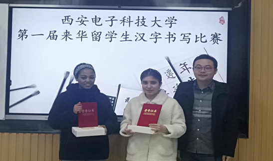 从左到右:语言生琳达(坦桑尼亚籍)、汉语国际教育专业古丽娜(土库曼斯坦籍)获二等奖