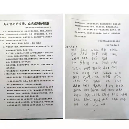 当天晚上,葛桐同学设计调查问卷并转发至班级群,向同学们征集遇到的问题和困难,得到了同学们的积极回复。崔昊言同学每天在工作群为大家分享正能量推文为大家加油鼓劲。12月26日晚,小组成员将收集到的抗疫相关的知识资料打印并分发至每个宿舍,并在抗击疫情倡议书上签字,同时让同学们随机抽取了提前收集好的手写贺卡,以温暖而又不缺乏仪式感的方式号召大家注意防护、积极抗疫!