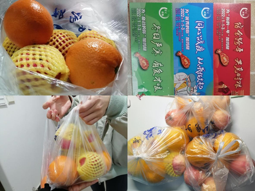 外院20级研究生、续建5号楼5层的层长张楷涓同学告诉老师:当天下午,公司发送的元旦礼物已送达到外院学子手中,各位小可爱们收到这份“惊喜”也都激动万分,纷纷表示“公司送的水果不仅甜在嘴里,也甜在心里!”。