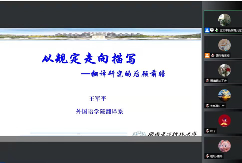王军平教授对翻译研究进行了总体的概览和介绍,首先借助模因概念提出翻译研究的发展模式,接着介绍了翻译研究所经历的各种不同的范式转换和视角变化。通过分析背后动因和学科发展需求,王教授指出当前的翻译研究正从规定走向描写。他既介绍了翻译研究的危机,也分享了从规定到描写的方法论意义,包括研究视角的变化、译者主体和译者的社会性。最后,王军平教授与参会师生进行热烈互动,耐心回答了大家提出的问题。