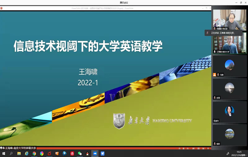 在参会教师的热烈欢迎中,南京大学外语部教授、外国语言学及应用语言学专业博士生导师王海啸老师进行了题为“信息技术视阈下的大学英语教学”的精彩报告。王海啸教授以问题为导向,抛出外语教学需要明晰的六大主要问题,教什么、谁在学、学什么、怎么学、怎么教和怎么评,并以亲身的教学实践和深刻的教学反思分析回答了六大问题。通过无信息化和信息化不同视阈的对比,王海啸教授剖析了大学英语教学目标的进阶,培养员工的综合语言应用能力,数字素养的核心能力,语言、思维和行为方式。教、学者运用信息化资源与工具,研学信息化背景下的教学内容和资料,更新教法和学法,实现线上线下、现实虚拟、同步异步交互式教学,并通过学习数据和智能反馈全面、客观地评学、评教。王海啸教授的报告结语发人深省,信息技术对外语教学的影响是全方位的,信息技术在不断推动着外语教学的改革,外语教学也应向信息技术提出新的要求。